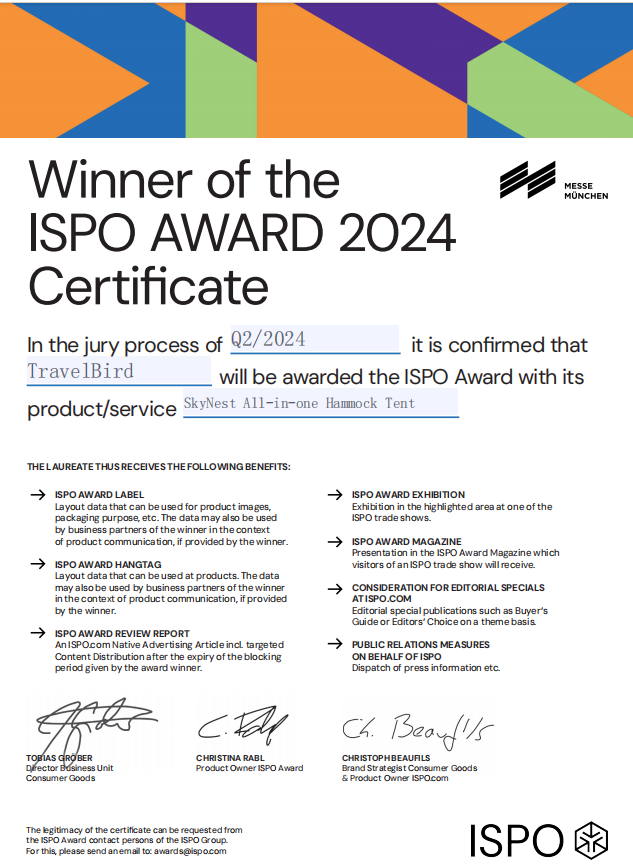 For us, winning the ISPO award means a lot, it recognizes our efforts in the fast growing global outdoor market. It means that after years of research, development and experimentation, our products have gained professional recognition. It also signifies that the TravelBird brand has been recognized and accepted by more people.