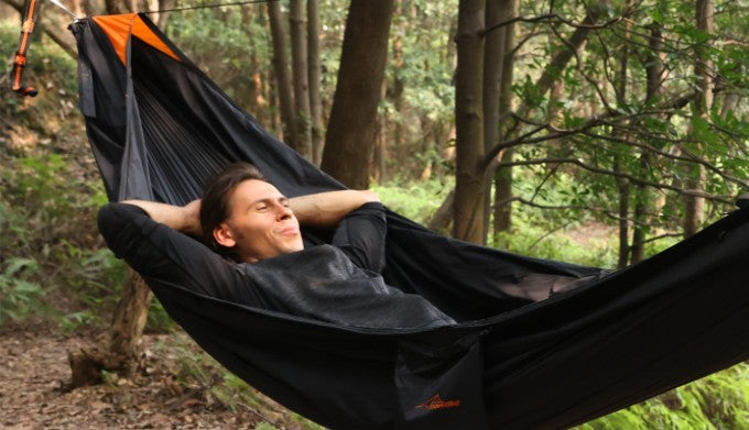 SkyNest hammock is perfect for camping in cold weather with underquilt and overquilt.