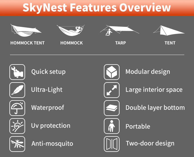 SkyNest hammock shelter integrates a hammock, canopy, mosquito net, as well as compatible with a camping mat and underquilt.