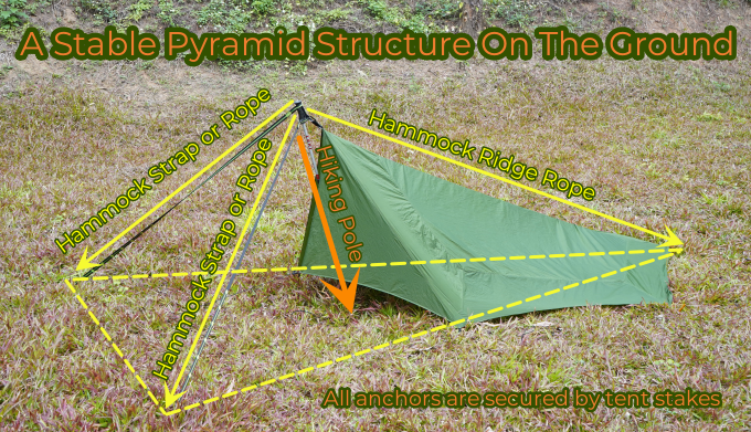 With the help of two hammock straps (or ropes) and hammock ridgeline and tent stakes, the pyramidal, triangular vertebral skeleton is a very stable structure. The hammock rainfly tarp fits into this structure to form a solid ground tent. *Trekking poles are not included with the Kickstarter rewards.
