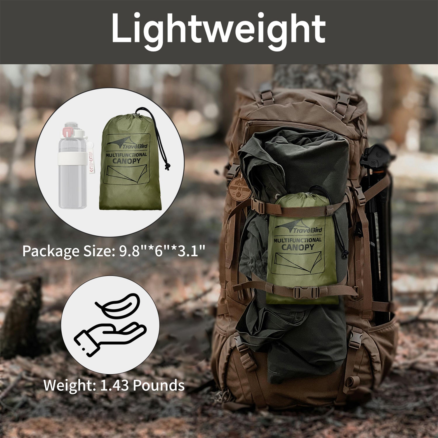 • 【Lightweight & Compact】Weighing only 1.43 lbs, the Travel Bird camping tarp is crafted for backpackers and hammock campers who prioritize weight savings without sacrificing durability. Its compact pack size (9.8x6x3.1 inches) fits effortlessly into any backpack, making it the perfect companion for long-distance hiking, bikepacking, and outdoor adventures.