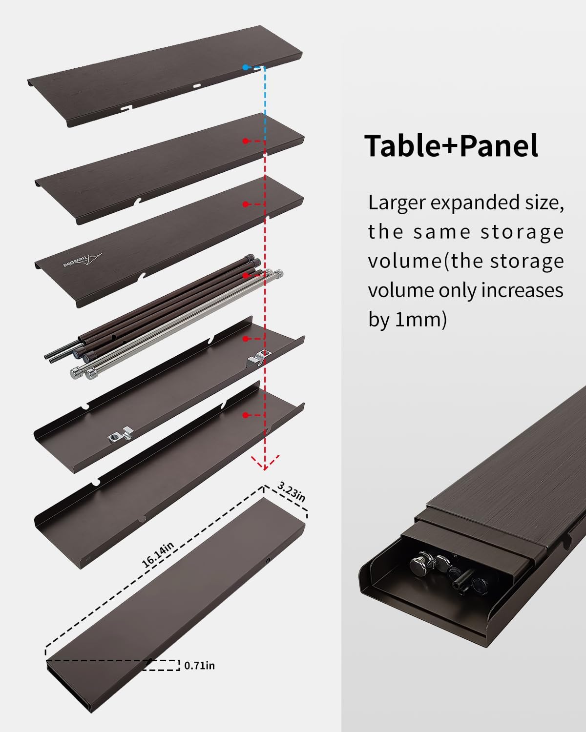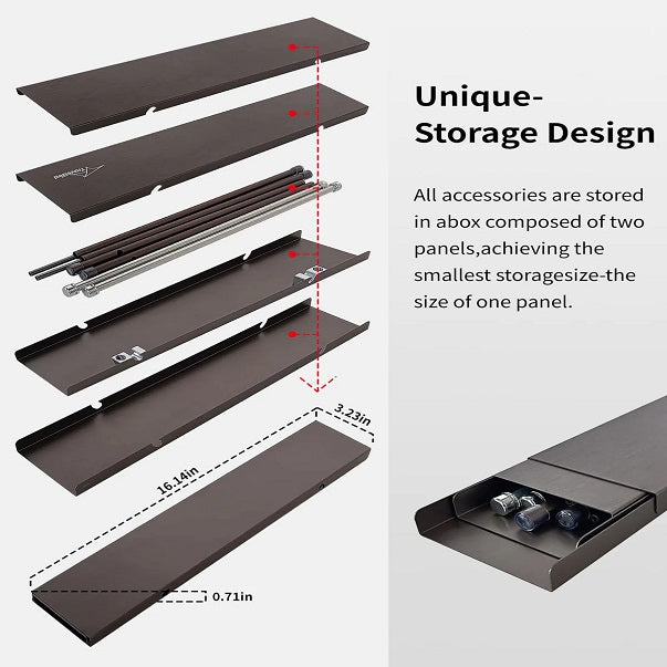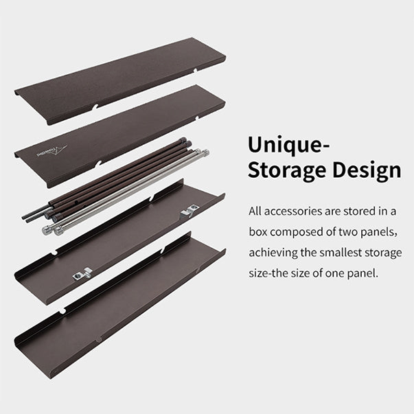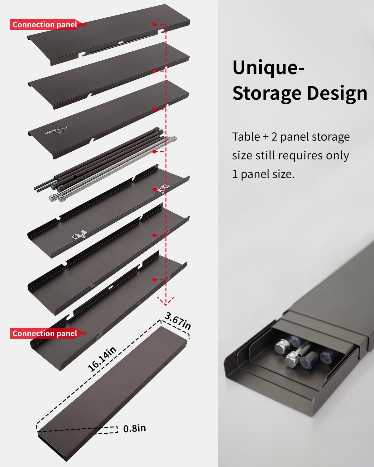Go further with lighter gear. A lightweight and compact folding table is especially important for outdoor.Unique storage design, all accessories are stored in a box composed of two panels to achieve the minimum storage size—about the size of one panel.