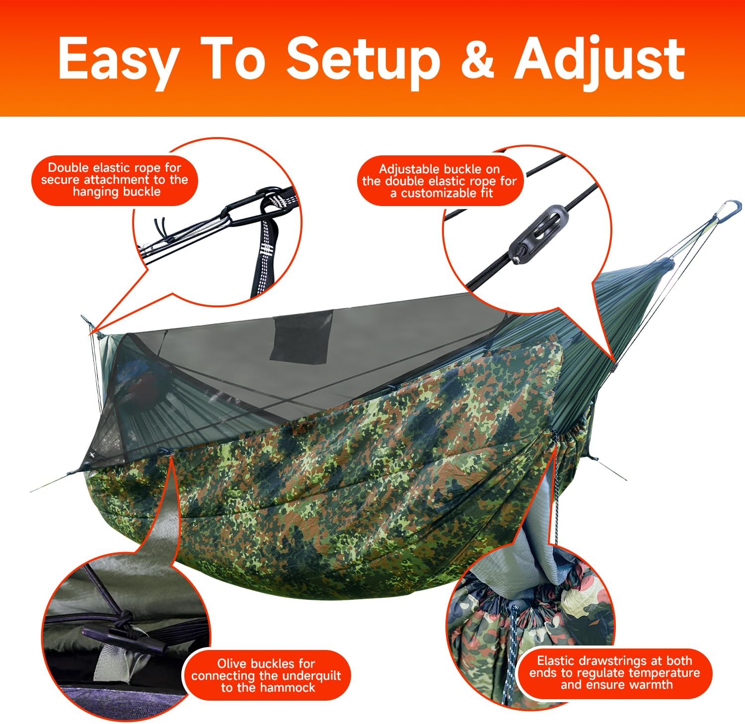 Easy Setup:Our upgraded dual elastic straps provide enhanced support, while bungee cord loops on both ends ensure quick adjustments and easy takedown. Spend less time assembling and more time enjoying your relaxation!
