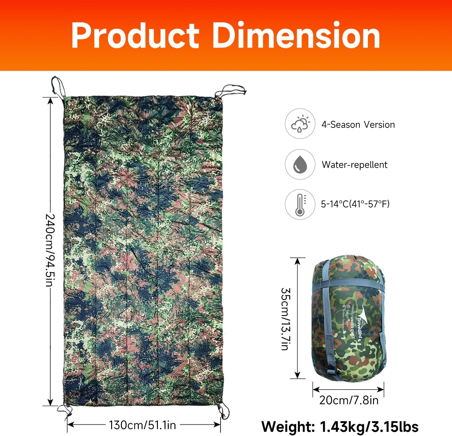 Compact & Lightweight:Weighing in at just 2.55 lbs and compressing to a convenient size of 11.8x 7.9x 7.9(inch) in the included compression stuff sack, this underquilt is perfect for camping, backpacking, hiking, mountaineering, and other outdoor adventures.